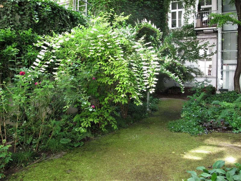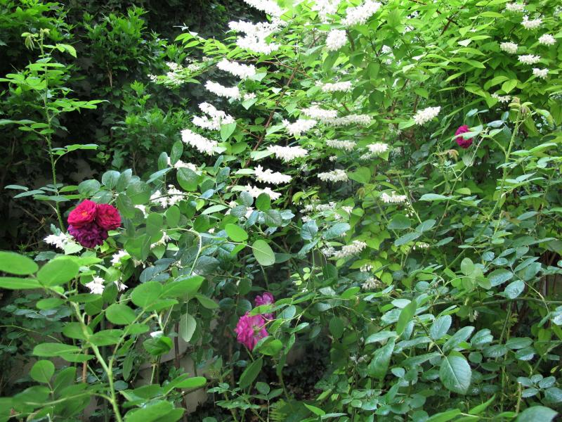 Der Duft der Kolkwitzie ist vor allem in den Abendstunden unglaublich betörend, das Gesumme von tausenden von Insekten ist schon von weitem zu hören, und gerade im sanften Morgenlicht wie auf dem Foto oben ist die Stimmung wirklich zauberhaft. Auch die Farne sind mindestens doppelt so üppig wie letztes Jahr, und die uralte Rose von meiner Oma, im zeitigen Frühjahr an den Rosenbogen hochgebunden, hat zahlreiche Knospen gebildet, welche kurz vor dem Aufblühen sind.
