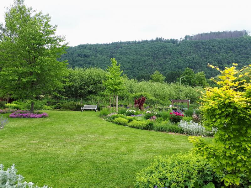 Der nächste Favorit ist das erste mit dem langen Band gelber Wiesentaglilien durch den Garten.