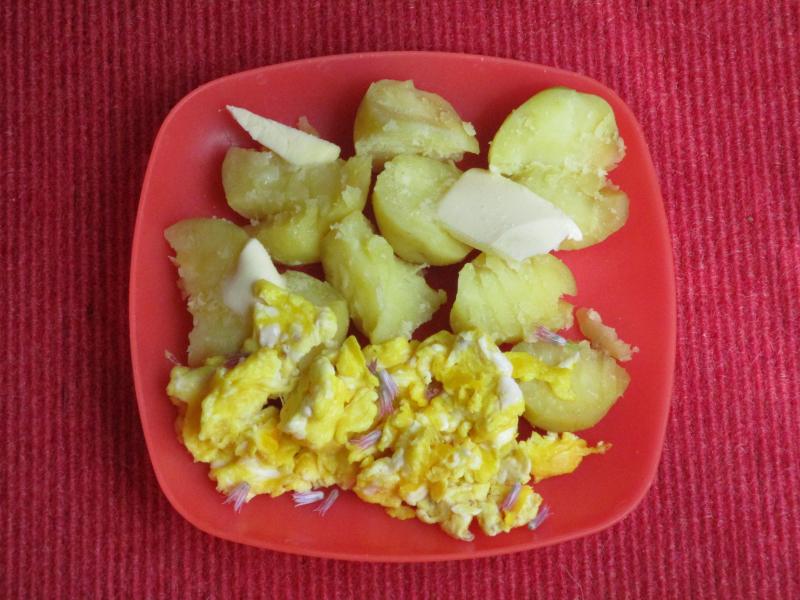 Hier sollte es heute solche frischkäsegefüllten Kartoffeltaschen mit Rote Bete-Herings-Salat geben. Aber aus Schonkostgründen wurde daraus dann Pellkartoffeln mit Rührei.