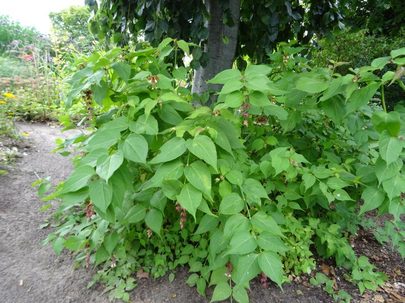 Bei mir versamt Leycesteria formosa sich gern. Hier zum Beispiel am Fuß einer etwa 30 Jahre alte Trauerbuche.