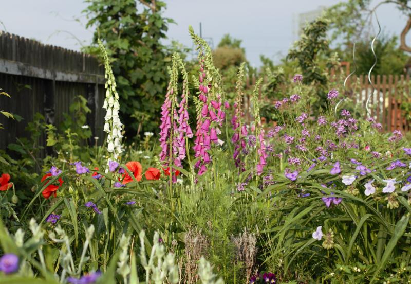 Der Rosenbeet wo die Rosen ziemlich zurückgefroren sind und jetzt die Stauden und Fingerhüte die Regime führen