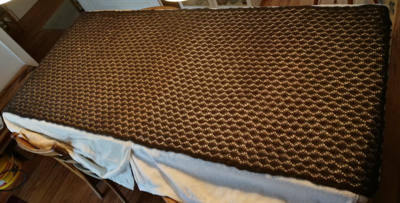 Ich habe gestern meinen aktuellen Schal beendet. Den werde ich jetzt aber selbst behalten. habe ihn gerade zum trocknen auf eine Matratze gelegt. passte mit leichtem Überstand geradeso drauf. also 2,20 m x 0,90 m.