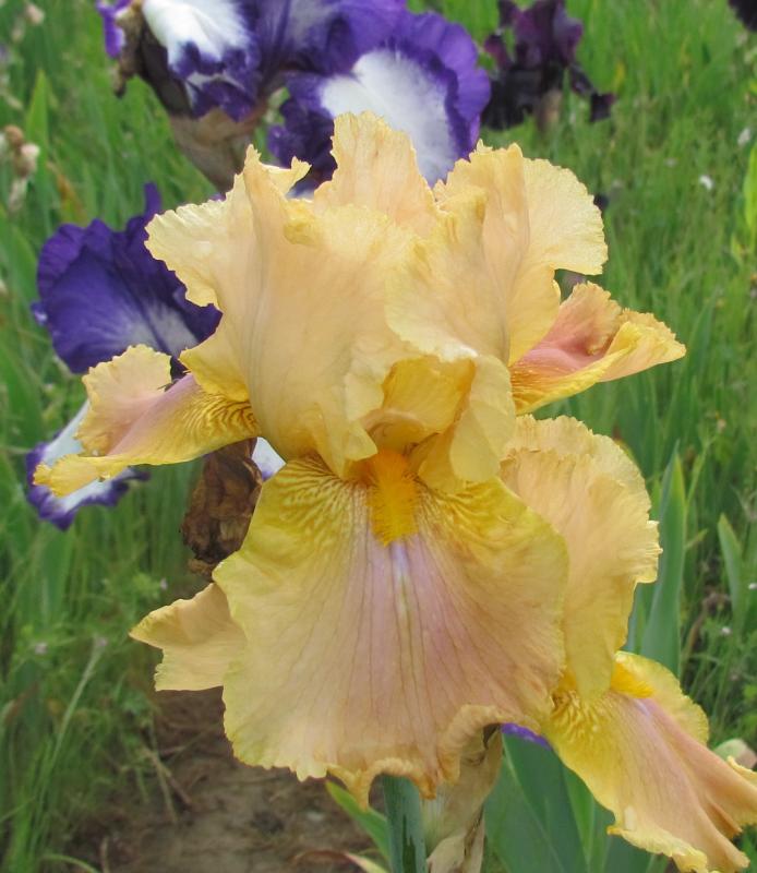 Und noch TB `Matinata´, im Hintergrund oben. Davor unten, leider unscharf, eine Iris aus dem Norden die zum Vergleich hierher kam. Die Unterschiede festigen sich wohl (Höhe, Blüten- und Knospenform passen nicht, die Farbe wirkt blauer) und da ich das bisweilen nicht ignoriere, ist es wohl doch eine andere Sorte. Verwandt scheinen sie aber zu sein.