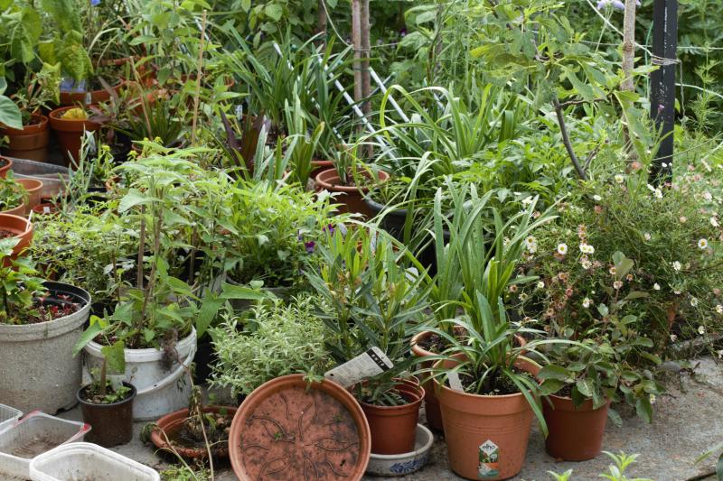 Im Hintergrund kan man sehen überall versteckte und hingestellte Töpfe mit etwas drin. Auf der betonierte Terasse passen nicht mehr hin.