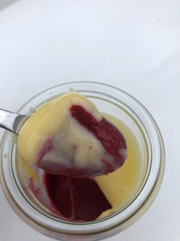 Wir hatten gestern Maibeermousse mit Vanillesoße zum Nachtisch.