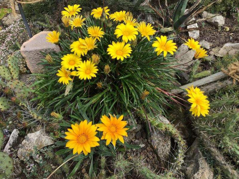 Im Sukkulentenbeet blüht jetzt und dann bis zum Frost Gazania lineares. Die zwei vorderen Blüten ist ein Sämling. Er hat an der Basis jeden Blütenblattes einen schwarzen Punkt, welchen die Mutterpflanze nicht hat.