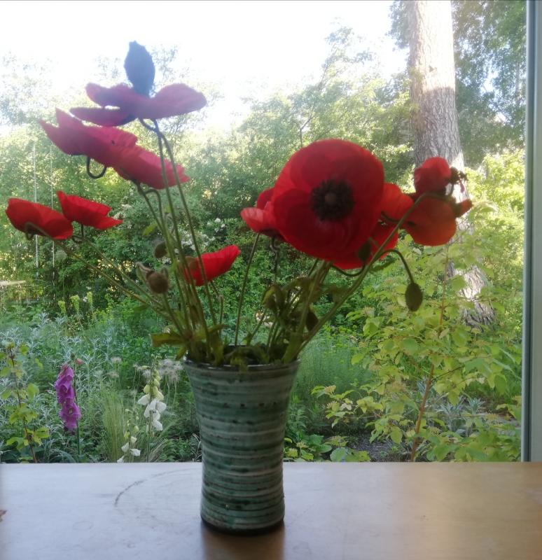 Vorgestern fand ich im Zweitgarten einen großen Klatschmohn am Boden liegend vor, wahrscheinlich von einem Viech plattgewalzt. Ich warf das ganze Trumm abends in s Auto, vergaß es zuhause und holte es erst am nächsten Morgen raus. Alle Stängel mit gut entwickelten Knospen schnitt ich ab und stellte sie in eine Vase. Das ist das Ergebnis heute morgen.