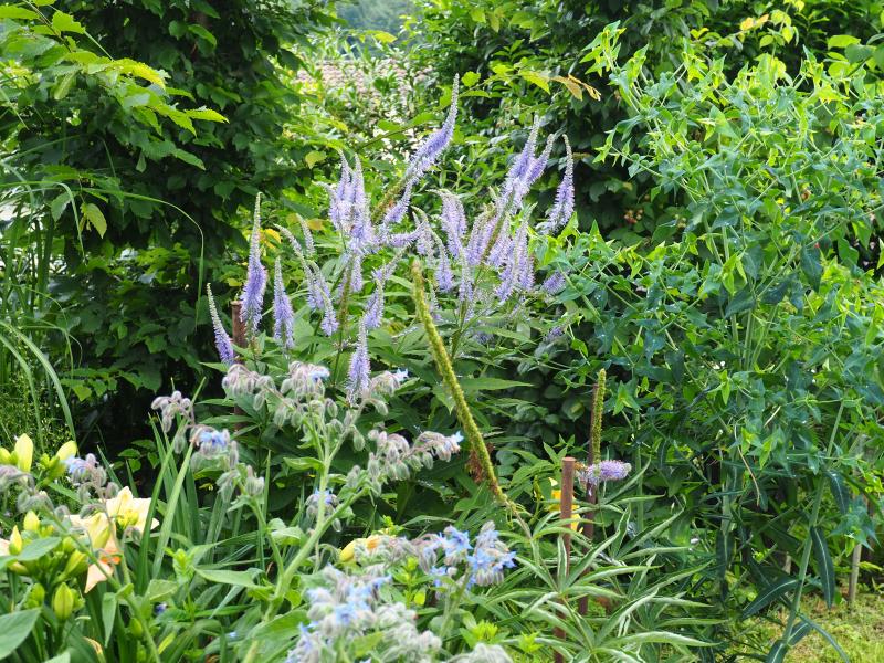 Veronicastrum sibiricum subsp. japonicum `Okamoto´ ist eine ganz andere Klasse. Etwas blass, aber viel mehr Farbe pro grüner Blattmasse. Außerdem sehr lässig. Die Triebe musste ich schon vor der Blüte alle ins Gerüst zwingen und darauf achten, dass sie nicht wieder rausflutschen. Sie liegen gerne bodeneben rum. Achtsam aufgebunden sind sie ein schöner Anblick.