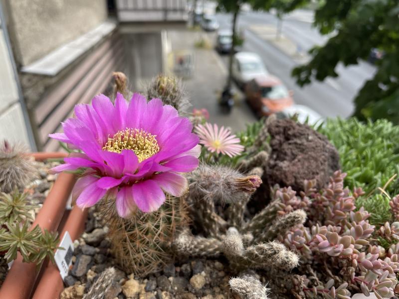 Hier blüht gerade Echinocereus coccineus, schon ewig alt, aus den 90er Jahren. Blüht jetzt endlich mal! regelmäßig seit 3 Jahren, vorher nie.