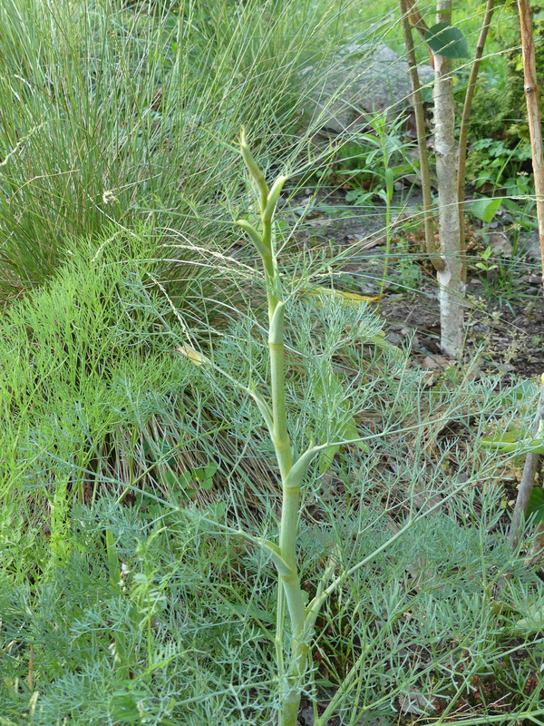 Update... der Blütenstand beginnt, sich zu verzweigen. Aus den Blattachseln kommen weitere Blütenäste. Einige Fotos bei fb heute stießen mich dann doch nochmal auf Ferrula. Mal sehen, wie lange wir bis zur Blüte noch auf die Folter gespannt werden. Schiebt deiner auch schon, lerchenzorn? Hier ist es die einzige von 7 Pflanzen, die blühen will.
