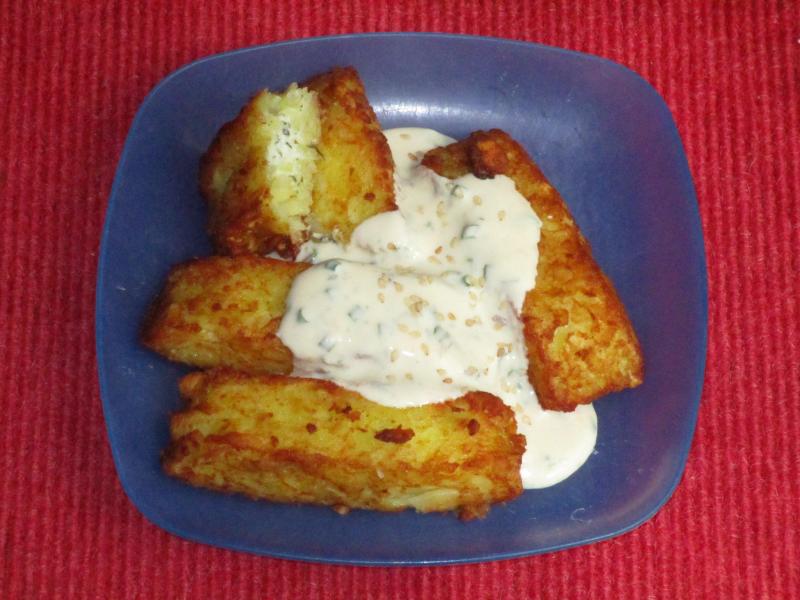 frischkäsegefüllte Kartoffeltaschen mit erfrischender asiatisch gemeinter Joghurtsouce