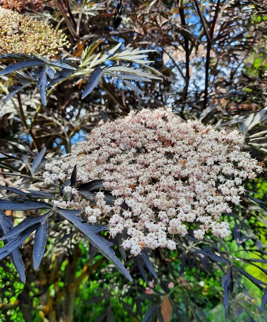 Noch mehr morbid, schwarzer Holunder. Totgesagte leben länger, denn nach einem sehr radikalen Rückschnitt (danke, nicht liebe Nachbarn :-[) war er sehr beleidigt. In diesem Jahr voll in Blüte.