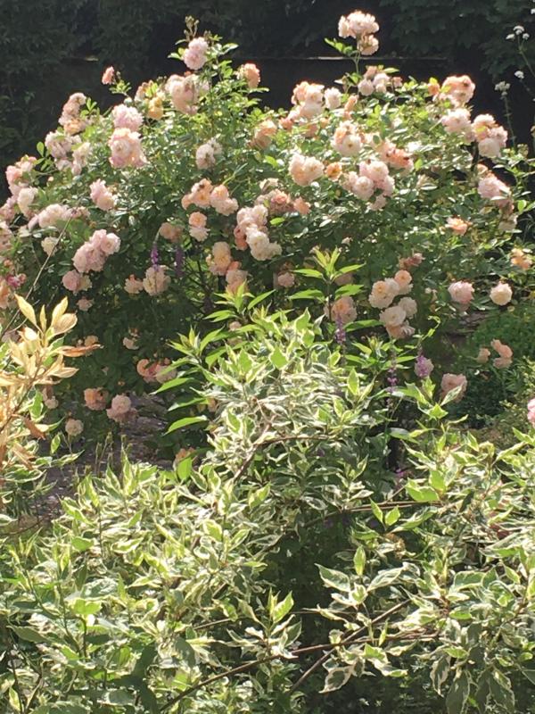 Die Agnes. Jedes Jahr schwör ich mir, sie fliegt raus. Teerosenblüten auf Rugosabeinen, das muß einem Züchter erst einmal einfallen. Die Blüten - ein Traum, aber das allererste Opfer der Junikäfer, die im Startloch sitzen, kaum schaffe ich es, eine unversehrte zu fotografieren. Und dann der Wuchs: Dem ist einfach nicht beizukommen, ich habe alles probiert. In manchen Jahren helfen auch die Rugosabeine nicht, dann friert sie stark zurück, muß entsprechend geschnitten werden und treibt endlos lange Triebe, an denen, wie Perlen aufgereiht, die Knospen verheißungsvoll sitzen, noch...