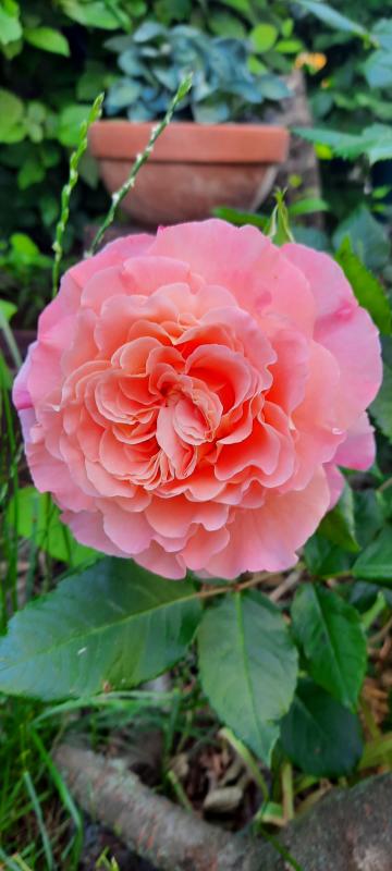 Die hier scheint jetzt ihren Platz gefunden zu haben. Endlich mal gesundes Laub und mehr als nur eine Blüte. Die Umpflanzaktion hat sich wohl gelohnt. Ich bin froh, dass ich ihr die Chance gegeben habe und sie nicht entsorgt habe. Der Duft ist fantastisch. Fruchtig, zitronig und intensiv. Wie sie heißt weiß ich mal wieder nicht. Sie sieht der Augusta Luise von Aella ähnlich. Nur gibt es diese Farbkombination aus rosa und apricot bestimmt öfter...