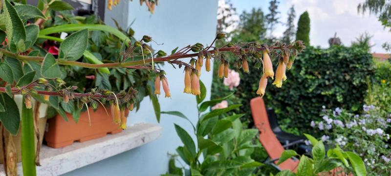 Mitraria coccinea ist ein üppiger Kletterstrauch, bei mir jetzt 2 Meter hoch und im Kübel - und mir eigentlich zu sperrig für das Winterquartier. Dieses Jahr blüht er mit recht großen Blüten(knapp wie Fingerhut) doch ganz gut, so dass ich nochmal überlegen muss, ob ich ihn wirklich erfrieren lasse. Ungewöhnlich milde Winter würde die Pflanze sogar draußen überleben.