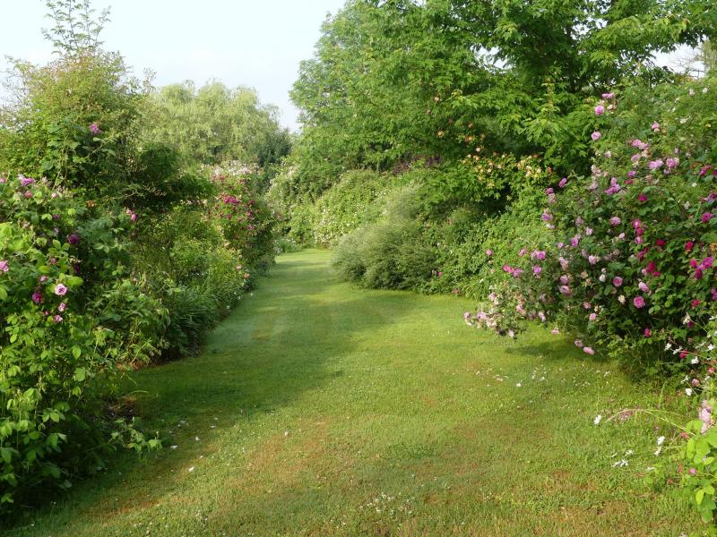 Kleiner Durchgang .Rechts und links vor allem Gallicas und Moosrosen.