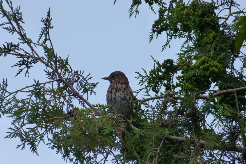 Sie sitzt sicher in einer hohen serbischen Fichte im Nachbargrundstück.