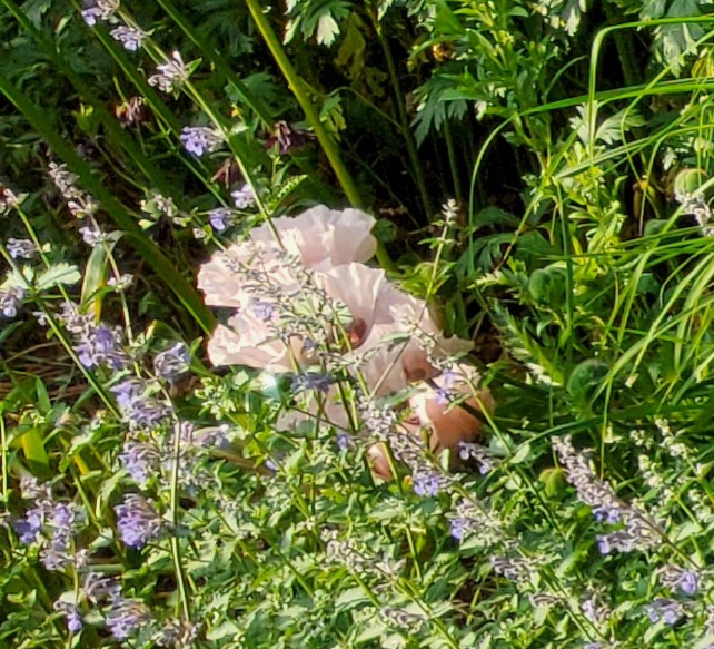 Hier noch mal mit dem drumherum, in vollem Sonnenschein wirkt sie schon deutlich heller, abends wenn es abkühlt, ist das Rosa eindeutig mit Graustich. Die Farbe scheint temperaturabhängig, je wärmer desto blasser.