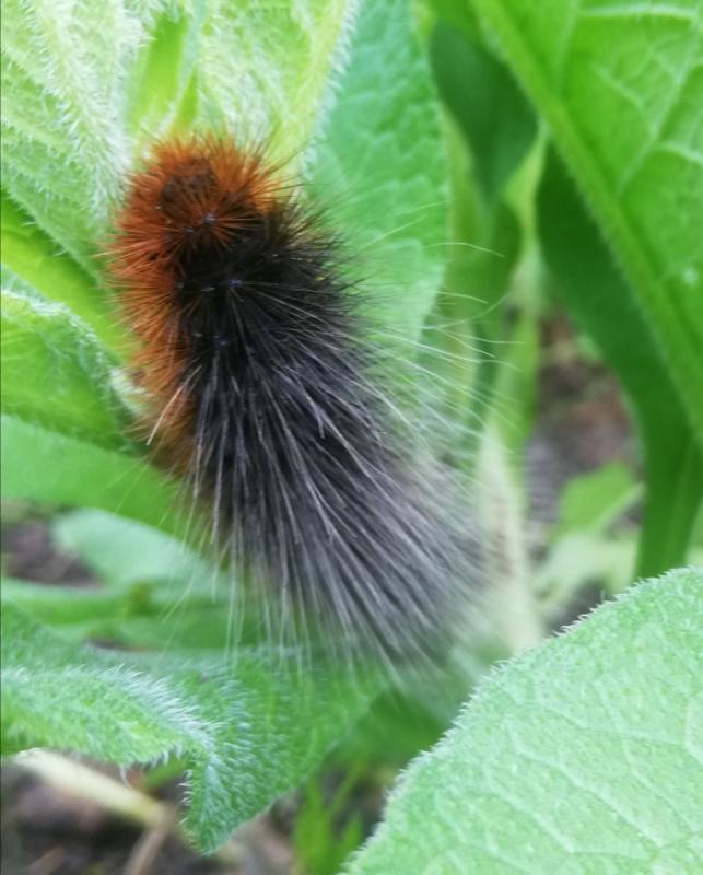 Heute gesehen. Die Raupe saß am Beinwell, aber das dürfte nicht die Nahrungspflanze sein. Ich tippe auf Arctia caja/ Brauner Bär. Sie war gute 7cm lang.
