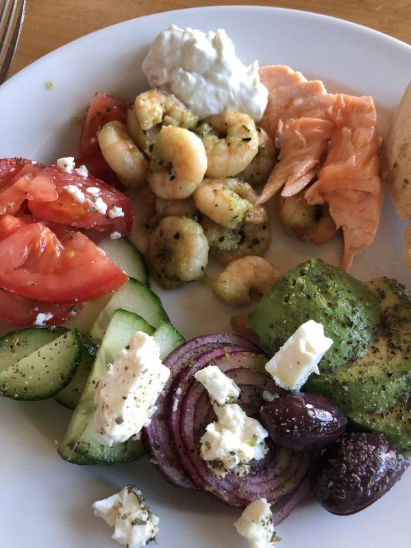 Zum Abendessen gab es Garnelen und Lachs vom Grill mit Bauernsalat, Avocado und eine, Rest Tzatziki von gestern