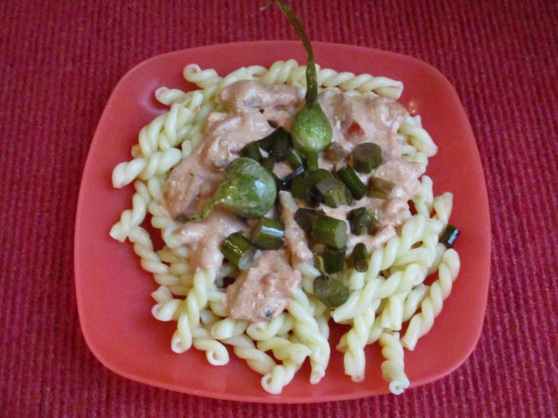 Hier gab es Gemelli mit Frischkäse-Tomaten-Soße (Frischkäse, Knoblauch, pass Tomaten, Kräutersalz). Essen 1 mit in Sojasouce gebratenen Porreeblüten (lohnt sich nicht nachzukochen ;)).