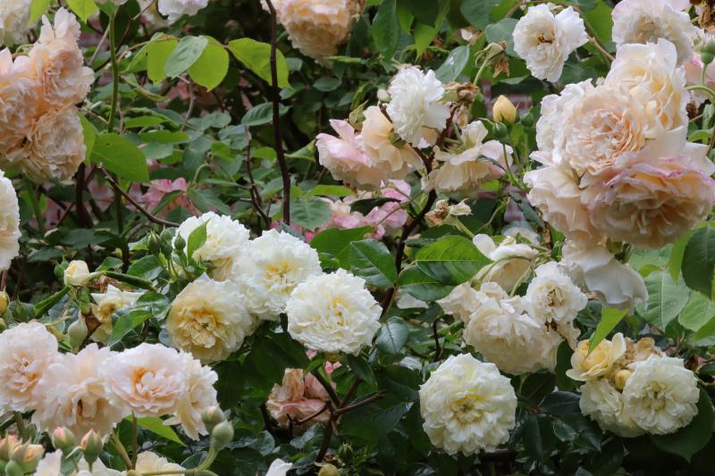 ´Goldfinch´erkenne ich dieses Jahr kaum wieder: so stark gefüllt habe ich diese Rose hier noch nie gesehen. ´Buff Beauty´wirkt hingegen ungewöhnlich kleinblütig und blass.