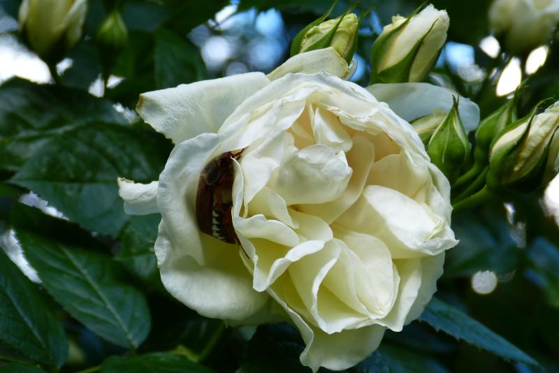 Dieser Maikäfer hat sich eine Rosenblüte als Schlafplatz ausgewählt.