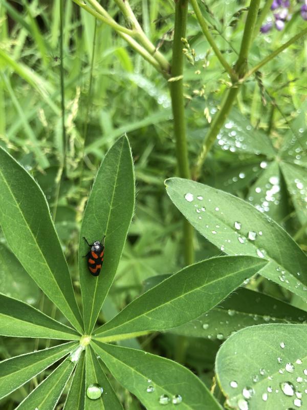 Dieses Tierchen schien sich in Lupinenblättern sehr wohl zu fühlen. Ich hoffe, man erkennt es.
