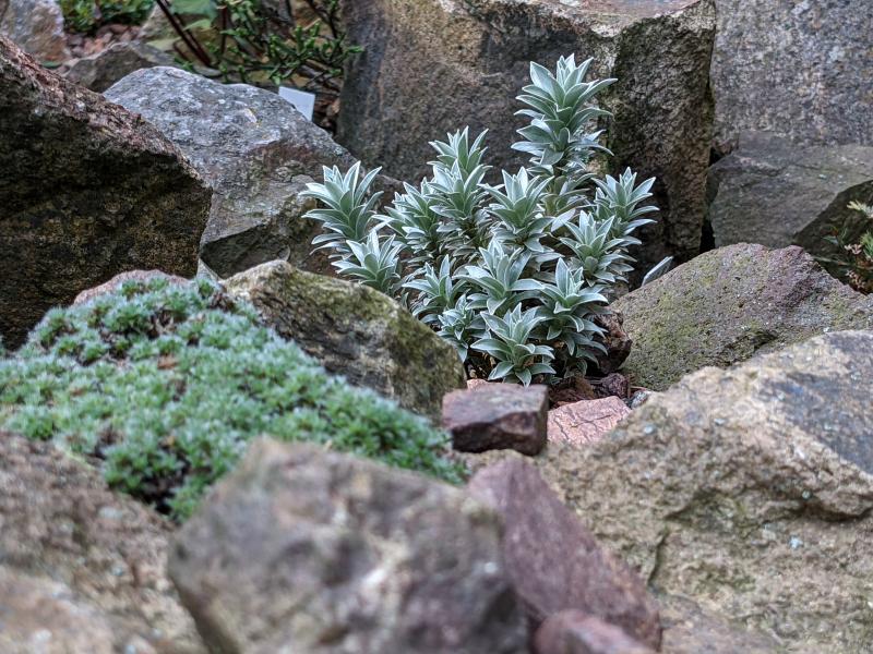 Das Laub dieser Pflanze ist etwas weiß-filziger als bei denen aus den Alpen. Nach einer Regendusche sieht es aber auch sehr grün aus.