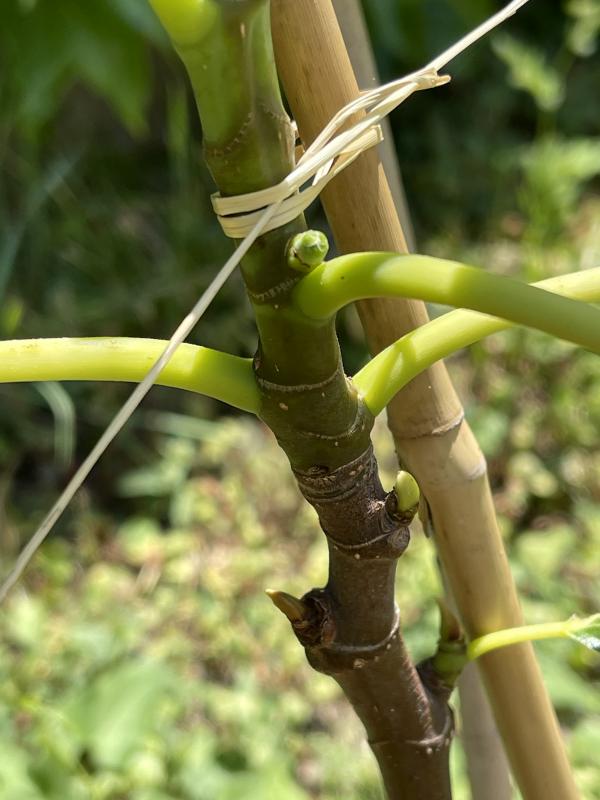 Sultane von Quissac. Kleine Herbstfeige unterhalb des gebundenen Strohhalms sichtbar, ausgepflanzt im April 2021.