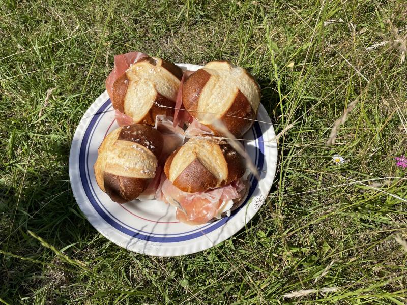 laugenbrötchen roh belegt mit mozarella di bufala und prosciutto di parma. eigentlich hätte es provolone picante statt mozarella sein sollen, aber sowas hat der einigermaßen nahgelegene bahnhofssupermarkt natürlich nicht.