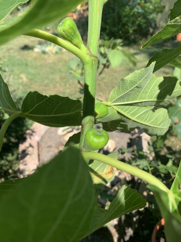 Vor zwei Jahren gab es 2 hervorragende dicke, gelbgrüne Herbstfeigen. Dieses Jahr hat sie 2 Blütenfeigen angesetzt, die sicher bald soweit sind und mehr als 10 Herbstfeigen