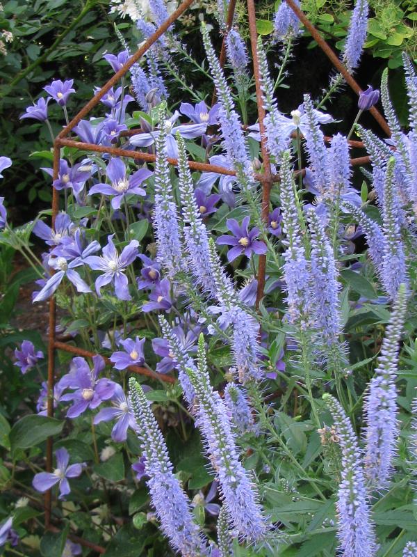Pseudolysimachion von der Staudengärtnerei braucht in voller Sonne öfter eine Kanne Wasser, im Halbschatten bekommt sie Wasser, wenn die Clematis Durst hat.