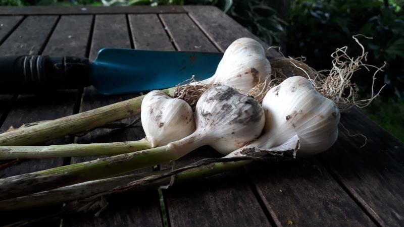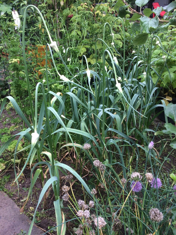 Ich hatte vor 2 Jahren Rockenbolle-Brutzwiebeln hier aus dem Forum bekommen, die wuchsen letztes Jahr zu hasselnussgroßen Monozehen, wie man sie vom `chinesichen Knoblauch´ kennt, dieses Jahr sollten sie jetzt normale Knoblauchknollen machen. Ich habe sie im Gegensatz zu dem Herbstsatz aus Zehen noch nicht geerntet, das Laub steht noch ganz gut da und die erste `Blüte´ ist nun auch offen.