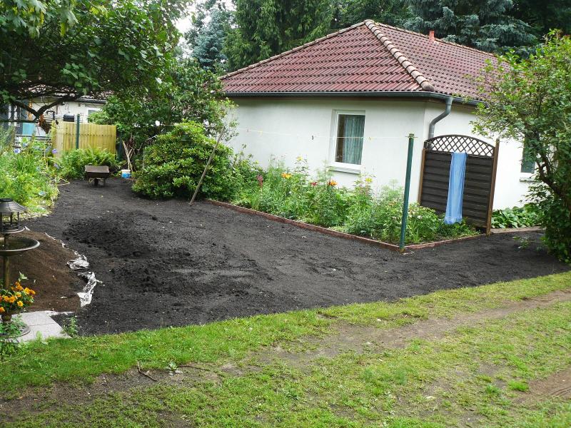 Hinter dem Haus eine größere Fläche Wildgräser abgestochen und gesiebt. Dann mit 6 qm Komposterde wieder aufgefüllt. Nun muss noch planiert werden . Wer möchte das gern machen ?