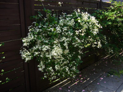 Staudenclematis, die sich malerisch an den Zaun und die anderen Pflanzen lehnt und duftet...