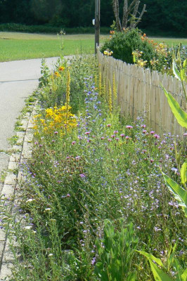 Da ist es auch eher mager, trocken und steinig. Ich weiß gar nicht, was da alles wuchert, vieles sind einheimische Wildblumen. Es ist eine Mischung aus langlebigen Stauden ( z.B. Wasserdost (der gedeit da ungeachtet seines Names bestens), Mädchenauge, Sonnenröschen, Bartblume, mehrjähriges Bohnenkraut, Wiesensalbei, Knäuelglockenblume, Schafgarbe, Staudenlein...) und vagabundierenden ein- und zweijährigen (Färberkamille, Rapunzelglockenblume, Wollköpfige Kratzdistel, Wilde Karde, Natternkopf, Wilde Möhre, Strahlenbreitsame...). Sieht alle paar Tage anders aus und ist jedes Jahr wieder eine Überraschung :D.