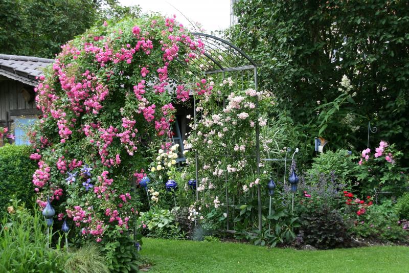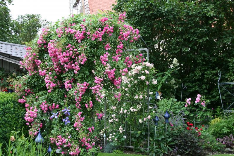 An deiner üppigen super Dorothy rankt sich noch eine sehr schöne blauviolette Clematis empor. Weißt du zufällig wie sie heißt?