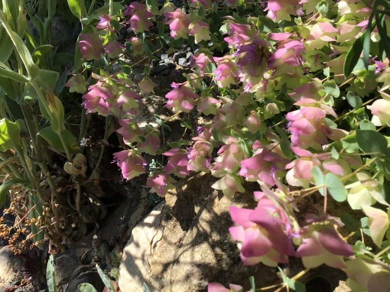 Im Steingarten blühen jetzt verschiedene hopfenblütige Formen des Origanum. Die schönste ist nach meiner Meinung O. Kent Beauty. Sie ist nun schon mehrere Jahre alt und hat alle Wetterunbilden ausgehalten. Allmählich wird sie größer.