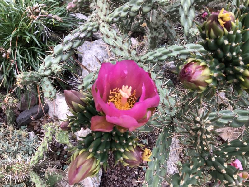 Jetzt beginnt Opuntia imbricata zu blühen. Es ist bei mir immer die letzte Art die blüht. Alle anderen Opuntien haben nur noch „ Restknospen „