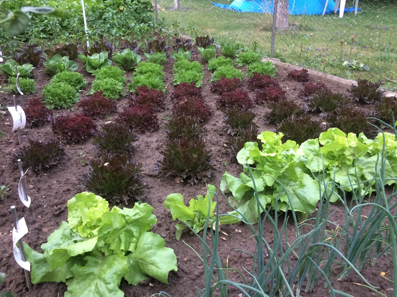 Auf dem Bild sind ein paar Salate zu sehen, die ich zum Start des Threads gezeigt hatte. Ich weiß, daß die Pflanzen viel zu eng stehen, aber als ich sie im April augepflanzt hatte, hatte ich ihnen diese Überlebensrate und Wachstumsstärke nicht zugetraut.