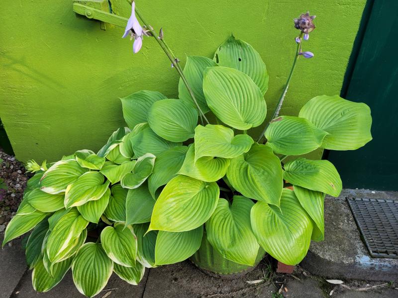 Dies ist noch so eine Überlebende des Hosta-Massakers im Nachbargarten, ebenfalls völlig anonym. Ich hatte die zerfledderten Teilstücke erstmal getopft und sie hat sich gut erholt. Hat jemand eine Idee bezüglich möglicher Sorten? Extrem dickes ledriges Laub, Blätter wölben sich an den Rändern so tellerförmig nach oben.