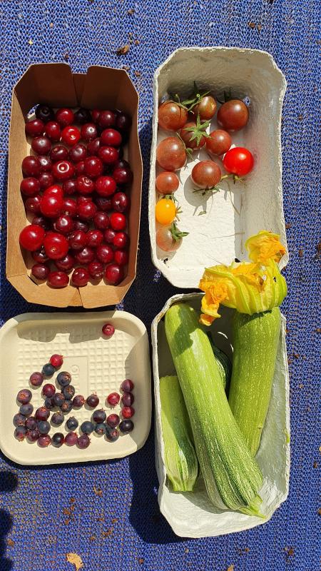 Und um beim Thema zu bleiben, außerdem hab ich auf die Schnelle noch die letzten Sauerkirschen und Felsenbirnen geerntet und ein paar (leider nur) kläglich Tomaten.
