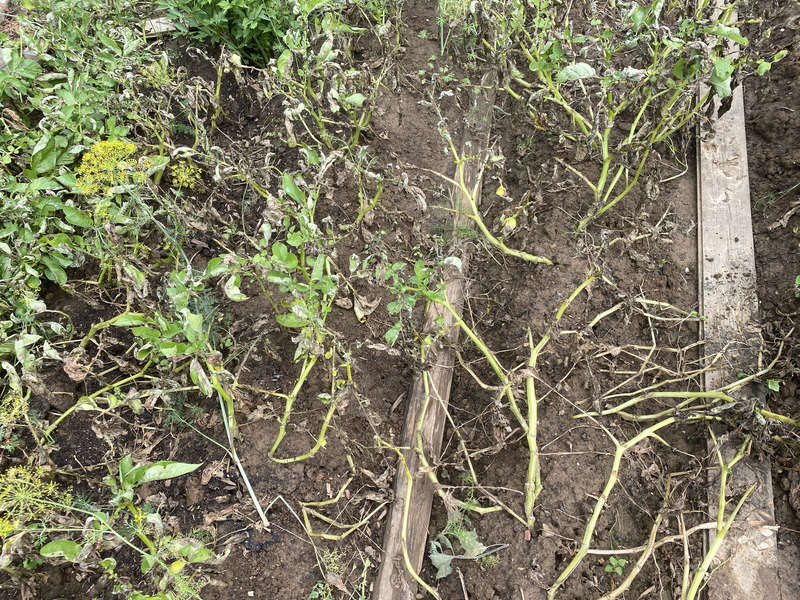 Wird irgendwie nie was. Die Jahre vorher sind sie buchstäblich vertrocknet und jetzt in den ständigen Niederschlägen verfault. Wenigstens die Braunfäule hat ihren Spass. Alles über die frühesten Frühkartoffeln hinaus ist Vergangenheit.