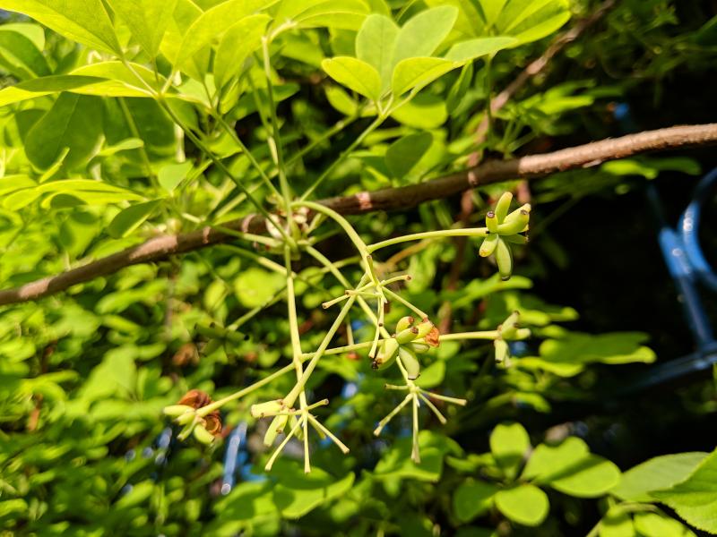 Übrigens denke ich, dass die Fruchtansätze sich hier tatsächlich gut weiterentwickeln - aber interessanterweise nur die wo ich die Blüten handbestäubt hatte. Die anderen haben sich mittlerweile fast alle verabschiedet. Ich weiß das so genau weil ich zu faul war eine Leiter zu organisieren - die ganz oben wachsen habe ich nicht bepinselt und die fallen ab. Die wo ich rein größentechnisch drankomme, sehen alle gut aus. Ich nehme an, das liegt am Wetter - ich habe zur Blühzeit der Akebias überhaupt keine Bienen, Hummeln etc. fliegen sehen.