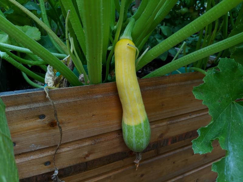 Wie man auf meinem anderen Bild sieht gibt es auch Zucchini mit ganz anderen Blättern ohne dieses Muster. Sortenbezeichnung kann ich Dir nur für die Sorten geben wo ich die Früchte eindeutig zuordnen kann. Ich setze die Zucchini irgendwie wild durcheinander, aber bei manchen sind die Früchte so characteristisch, dass eine klare Zuordnung möglich ist. Hier etwa ein Bild eines Zephyr Zucchinis.