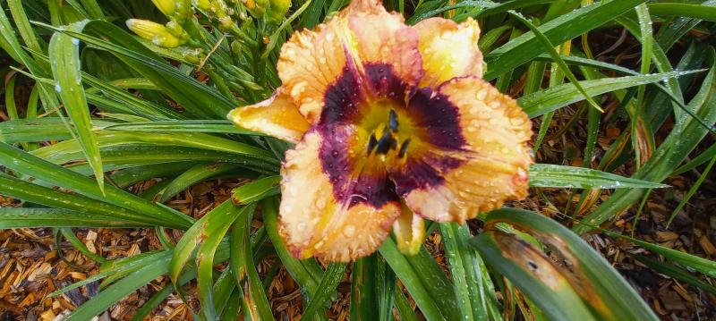 Hier liegt sie mit ihren schweren Stielen nach dem Starkregen leider flach, aber ich mag sie sehr. Sie stammt ja von der Taglilie 'Star of India' ab, die zwar völlig verregnet-, aber noch standfest ist.