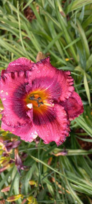Hier liegt sie mit ihren schweren Stielen nach dem Starkregen leider flach, aber ich mag sie sehr. Sie stammt ja von der Taglilie 'Star of India' ab, die zwar völlig verregnet-, aber noch standfest ist.