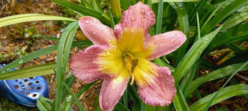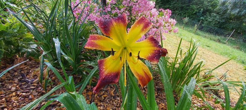 Hier liegt sie mit ihren schweren Stielen nach dem Starkregen leider flach, aber ich mag sie sehr. Sie stammt ja von der Taglilie 'Star of India' ab, die zwar völlig verregnet-, aber noch standfest ist.