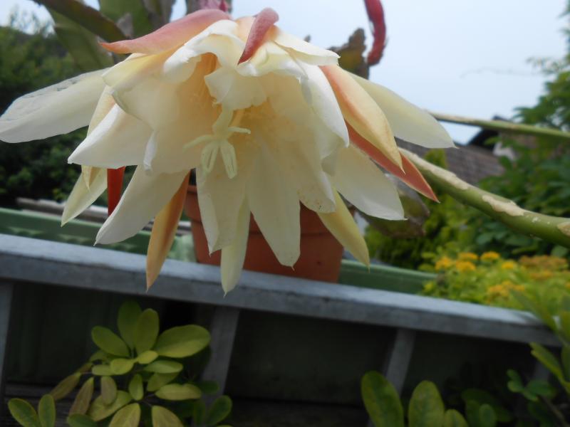 Hübsche Farbe, fast wie eine Pfirsichblüte. Bei uns hat heute dieser Blattkaktus geblüht.